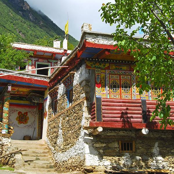 甲居藏寨坐落在河对面的山坡上,这里曾被评为全国最美丽的农村,也是最美丽的藏寨,风格与中路乡不同,它显得新鲜而热烈,色彩绚丽,一幢幢的顺山坡而建,五彩斑斓地点缀在绿树丛中,在明亮的阳光下那么醒目耀眼,远远望去很有风情。近观可见这些建筑很讲究,也是雕梁画柱,一层养家畜,二层住人。看着眼前的藏寨,虽然风格独特,但跑出这么远来观赏是否值得?其实,这些建筑和风情都存在于边远地区,除了它们自身的欣赏价值外,它们所处的地方一定会是风光异样,绚丽无比的。有时旅游的目的不一定非要是目的的某样景观,许多让人惊奇或迷恋的景色,也许就在你行程的路边。而此行的藏寨和碉楼,就已经够奇丽的了。梭坡也是以碉楼为主,但没有中路乡那么古老。由于住在了中路,所以我们就没有冒着烈日进去,只在对岸远观了一会儿。在丹巴县城吃了面条,回来时去了路边的墨尔多寺庙,上了香,寺庙不大,正在修。2:30回到东坡家休息了一下,4:00又出去,近一步探索中路乡。由于昨天夜里刚下过雨,乡间的小路很泥泞,车子几乎走不了,在险峻的山路上绕了半天,我们的性命都交给了这个孩子,吓得我好胆战,也没绕出多远,赶紧弃车步行吧,心里踏实多了。近观了几座碉楼,多数是四角的,也有六角和多角的,高低粗细都不同,有的与住房连在一些,有的是在住房边单建的。听说最早这里有人出去做官,知道了外面的争斗,回来便让家乡人建了这些碉楼,是为了防御敌人。天开始阴了,我们来到了全乡唯一可爬的碉楼前,里面很小,爬起来还是较吃力的。晚上又是打雷下雨,重复昨天的动作。 展开