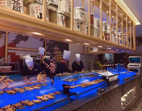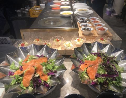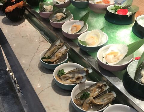 工作日的午餐时间来的,人不是很多,但是还是要叫号的,这里的美食品种挺高端的,小青龙,面包蟹,帝王蟹等等,都是无限吃的,我比较喜欢芝士焗小青龙,吃了好几个,饮料的品种多样,刺身中规中矩,烧烤类的选择很多。