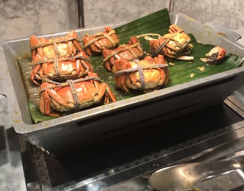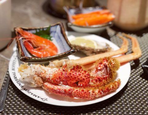 每次去吃自助餐,感觉都是在用生命去吃,尤其是像亚马逊这家海鲜种类特别多的自助餐厅。 走进餐厅,第一眼看到的就是摆放着各类海鲜的两个台子,可以生吃的,拿来涮煮的,鲜活现捞的,分门别类的摆放着,手掌长的小青龙尤其显眼。 我一般就盯着这两个台子吃海鲜了,还没法把所有品种都吃个遍,烧烤区和熟食区除了鹅肝其他也不吃了,再吃点水果,冰淇淋和烤榴莲就已经吃得很撑了。 每天晚上都会有不同的海鲜肢解秀,我们去的那天是帝王蟹,蟹腿需要排队拿,蟹肉不用。蟹肉很鲜活,稍稍煮一下就可以吃了,口感鲜甜。