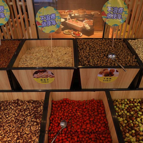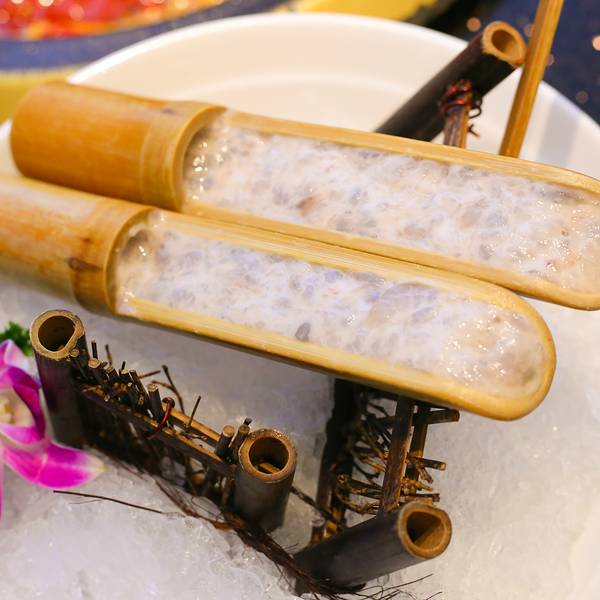 晚餐照旧安排了火锅,店铺位于解放碑商圈附近,在这周边逛街游玩的都很方便到达这里。门面很大,装修风格应该属于简约吧,在重庆火锅店中算是一种清流,视觉上清清爽爽,也没有油烟味,不太用担心吃完火锅一身味。进门就看到好几个大桶装满了免费的零食,非常的豪爽,有种大丰收的喜悦之感。有几个明档做着一些点心小吃,我们点了牛筋,熬制的劲道入味。熟食还有凤爪等,我们因为胃口不大而没点,下次去要再试试。每次吃重庆火锅必点的酥肉和红糖糍粑。这家店的酥肉属于干硬类型的,肥瘦相间,不油腻。红糖糍粑非常的糯,红糖味道突出。这两道是我每次吃火锅的保留菜,我还是很满意的。这家店的特色是鲜毛肚。非常原生态的毛肚活脱脱的拿到你面前,那个小推车的感觉真有点像在吃北京烤鸭,就在你面前片。你要半斤还是一斤,旁边有个电子秤可以精准的测量。被片下来的毛肚会放在苏打水中,店员解说这样可以更好的保鲜保脆,这可能是我吃过最奢华的毛肚了。在毛肚制作过程中,店员会解说关于毛肚的一些小知识,瞬间感觉自己不是在仅仅吃毛肚,而是在吃重庆火锅文化。