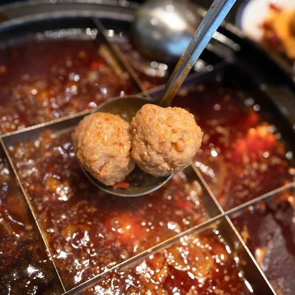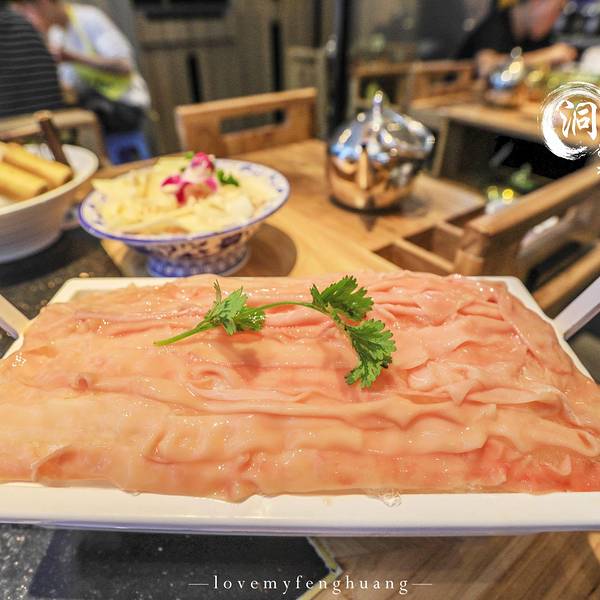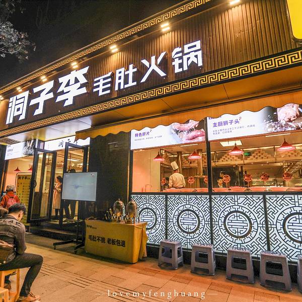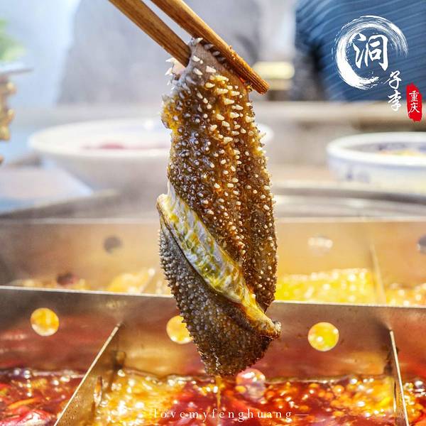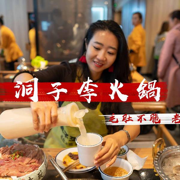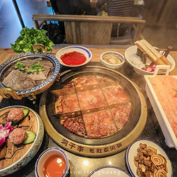 毛肚不脆,老板包退,这金黄色的招牌,一下子就吸引了走过路过人的目光,最爱吃毛肚,不知道这家的毛肚能否给人惊喜。才晚上6点多,门口已经在排队等座,火爆程度超出我预估,店里的操作间玻璃通透,能在等座的同时看到里面的厨师的忙碌,养肝明目、补气健脾的洞子李特色肝片;手工摔打农家土猪肉做成的狮子头;口感脆嫩的腰花,是这家的三大招牌菜。自助小料,还有多种坚果、小吃无限供应,每桌上的茶壶里沏的是四川本地产的老鹰茶,有止咳祛痰、清热解暑的功效,搭配重庆火锅再合适不过了。洞子李招牌毛肚,毛肚吃过不少,这家现撕现烫的毛肚打着“毛肚不脆,老板包腿”的口号,能有如此自信的招牌菜,可是直接从屠场直送到店,放在4度以下的冰鲜保存,吃的时候只需要涮9秒钟,入口爽脆化渣,为了保证食材的口感,建议10分钟内吃完。试了一下,果然脆脆的,而且很鲜。洞子李主厨狮子头,狮子头涮火锅还是第一次吃,狮子头需要煮的时间长一些,手工摔打的土猪肉,吃起来很软弹,里面黄色的是咸鸭蛋黄,汤汁渗透进了肉的每一处空隙里,咬在嘴中,肉鲜味,红汤味,还有鸭蛋黄的味道的融合,很美味。红糖糍粑,川菜的饭桌上再熟悉不过的一道主食鲜鸭肠,选自指定的好鸭和屠场,锁鲜到店,也是我最爱吃的菜之一虾滑,用Q弹来形容虾滑再恰当不过了,松软弹牙,吃起来特别的筋道鲜鸭血,本人平常是不太吃鸭血的,觉得比较腥,但是配上九宫格红汤锅底,遮盖了大部分的血腥味,口感细滑,味道还不错冰粉,清清凉的冰粉,入口爽滑,上面的坚果、葡萄干、糯米点缀,也是颜值很高的一道菜