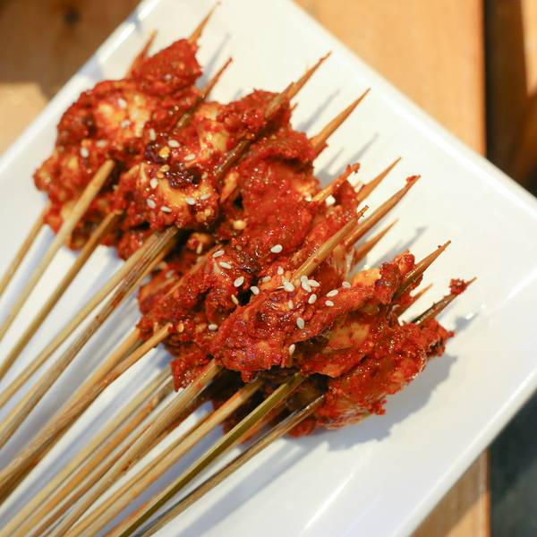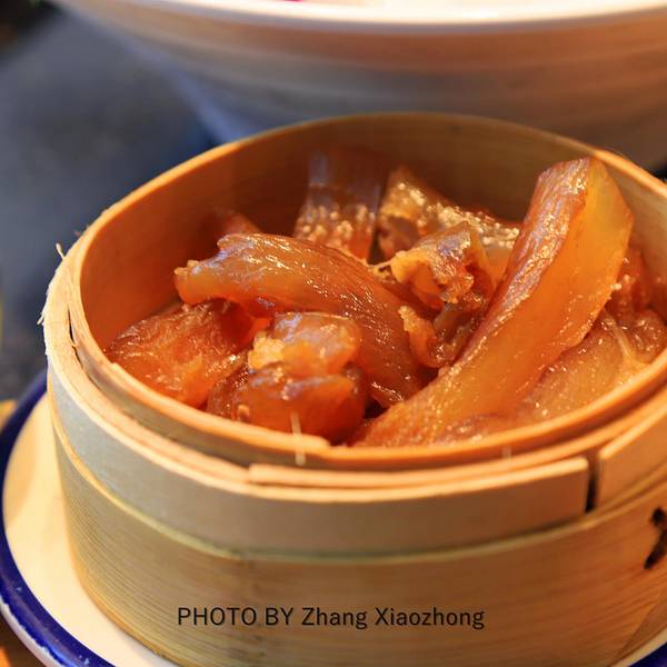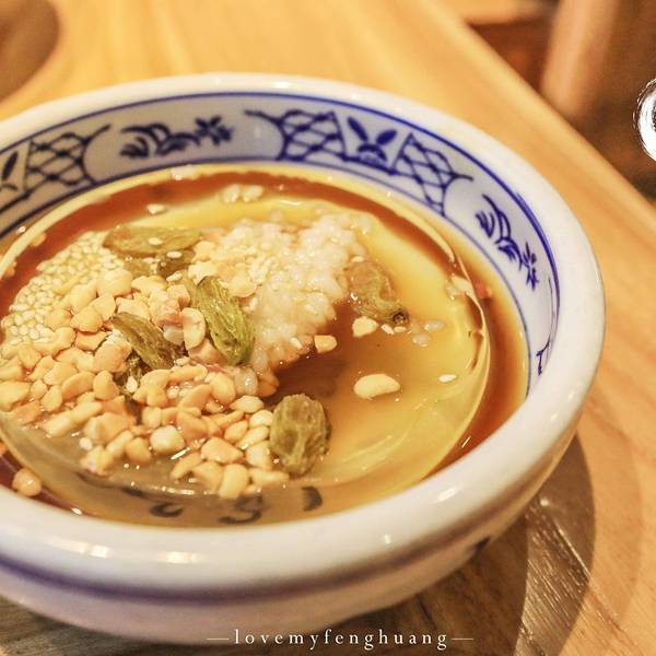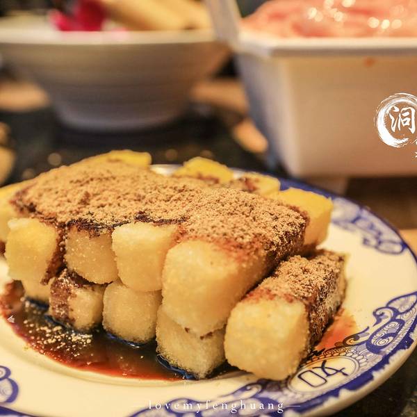 有几个明档做着一些点心小吃,我们点了牛筋,熬制的劲道入味。每次吃重庆火锅必点的酥肉和红糖糍粑