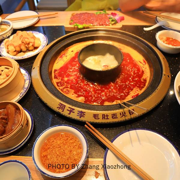 这家洞子李位于洪崖洞解放碑附近,所以逛街逛累了,步行过来是非常方便的。这家老火锅的整体口感是非常不错的,而且毛肚是他们家的杀手锏,一会儿详细说。然后装修方面也甚是大气,而且服务也是没的说,洗手间很贴心的配置牙刷、漱口水等,方便快速除味。一进入餐厅就觉得这些都是免费的吗?请原谅我直接小声的问了出来,一旁的服务员说是的,只要不浪费,全部免费吃(我说的是图2哈),然后服务员还很热情的帮忙推荐,他们家除了毛肚是最大的特色外,还有鸭肠,喜欢的话可以尝试。小料也是完全自助的,在当地吃红油火锅自然是要吃最地道的油碟,但是商家也很贴心的防止了别的调味料,方便照顾不用的口味。菜品方便选择了老肉片,每份肉的最佳涮煮时间,服务员在上菜的时候都会温馨提示,以保证吃到嘴里的是最佳口感。肝片与之前在别的店吃的真的也不同,口感很是不错,而且没有腥味,涮煮没多久,服务员就会提示,时间已经差不多咯,可以品尝喽~洞子李家的招牌毛肚是必点的,不然真的是白来一趟,首先厨师会向我们展示一只完整的毛肚,然后一片一片的从上面切下来,过秤后还有最重要的一部,那就是放到冰块上,保证其最佳口感,而且还要倒入一瓶苏打水,真的可谓是精益求精,口感自然是没的说,“毛肚不脆,老板包退”这句话可不是白说的。炸酥肉是每顿火锅必点的小吃,肉的本身在前期腌制就非常入味,尽管说现在二师弟的价格飙升的很高,但还是抵挡不住我们吃吃吃的步伐,关键是他们家的酥肉真心做的不错,脆且香。一边吃火锅,还能满足一边吃串串的心情,也是美美哒,所以同行的小伙伴还要了脆骨串串,这个要稍微多涮煮一会,因为它本身就经过辣椒腌制过,所以整体略辣,不过真的很够味儿。虾滑有满满的两份,份量方面是非常足的,而且口感超级鲜嫩爽滑,虾肉也能品尝出是非常新鲜的,这个绝对要给好评。再来说一下服务,本来我们想自己手打下滑的,但服务员小姐姐实在是太贴心了,来问了两次是否需要帮忙,我们都不好意思拒绝了,真的超级感谢。新鲜鸭肠被整齐的码放在冰上,用筷子夹起的瞬间仿佛就能感觉到它自身的爽滑Q弹,所以学着当地人的模样七上八下,那味道,只能说一个字,“我要给你点赞”!而且他们家的红汤锅底,汤泽红亮,很有当地人说的牛油味,而且辣度在我这个外地人吃起来也是适中,再加上新鲜的食材,来重庆的这第一顿火锅真的要给满满的100分。