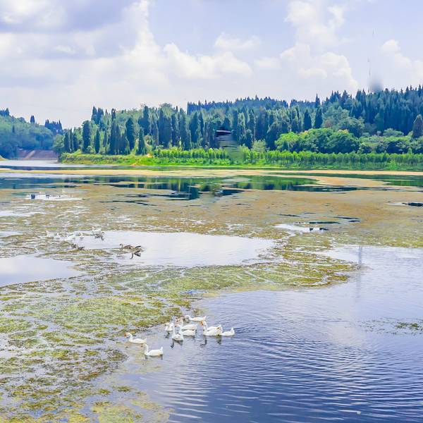 确切地说,三家村水库其实不算个景点,但也是昆明近些年的网红打卡地,因紧邻三家村而得名,水库位于昆明西部、棋盘山下,水质极好、景色优美,是这边徒步爱好者常走的线路,我们自驾上来的途中也遇到好几拨驴友~靠近三家村的路段,路面坑洼不齐,泥坑、水洼、碎石很多,还好我们的座驾给力,爬坡上坎、淌水沟、压碎石毫无压力,换成我家里的小轿车可能老早就卡在路上了~旅行的野趣自由还是得选择2020款BJ40城市猎人版这种车型~把车停靠在路边,发现周边还有不少钓鱼的朋友,三家村水库是这边的保护水源,航拍视角下的水库就像蓝色的镜面,是高山上璀璨的明珠,水面上水藻不少,生态环境一流~水库四周种植了一排排整齐的水杉,听说会随着季节的更替变换颜色,秋冬时节,红色的红杉倒印在水中,格外美丽。而此时正值盛夏,绿意葱茏。站在水库大坝上,山间的风穿堂而来,竟还有些许凉意~一群水鸭子在湖面游来游去,格外悠闲!还有几个水库除藻工人在水面作业,维持水库的水域健康就靠他们了~现在的水库大坝围上了铁栅栏,据说是为了防止安全隐患,同时也为了保护水域健康。三家村森林茂密,顺着水库大坝朝着山顶驰骋,就能抵达棋盘山国家森林公园,可惜时间有限,并没有预留游玩的时间。 Tips:棋盘山国家森林公园景色很美,门票仅需10元,还能开车长驱而入,时间富裕的话,推荐大家来。