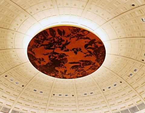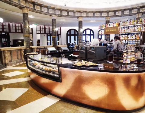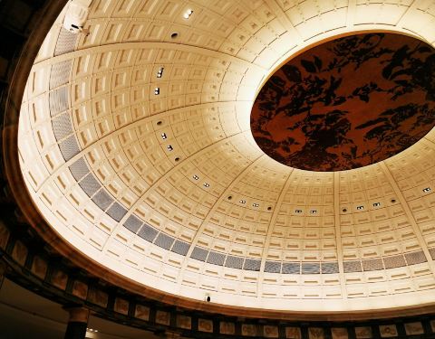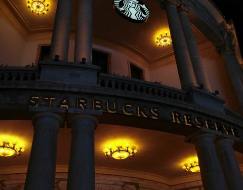 一楼中央大厅的穹顶辉煌大气,手工雕刻的古代钱币装饰环绕其间。 14根大理石柱,装饰着鎏金回型纹路,石柱下,12组汉白玉的交易柜台,触手依旧温润细腻。集合创意饮品,茶瓦纳专区,星巴克酒吧专区于一体的旗舰店...