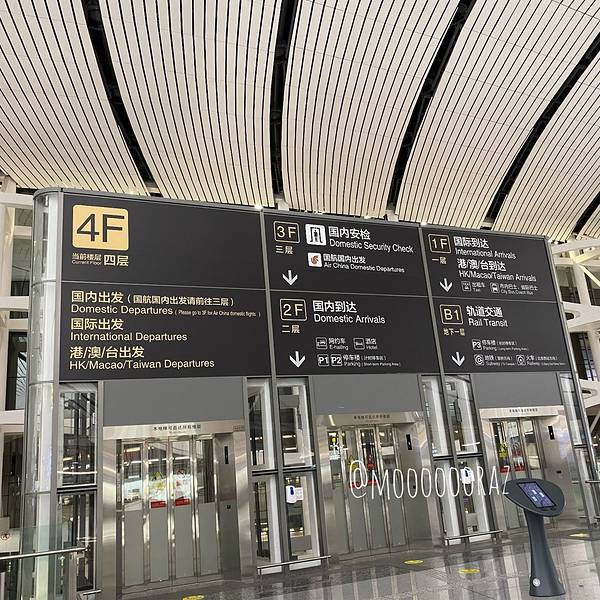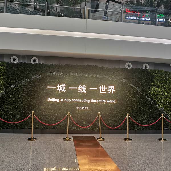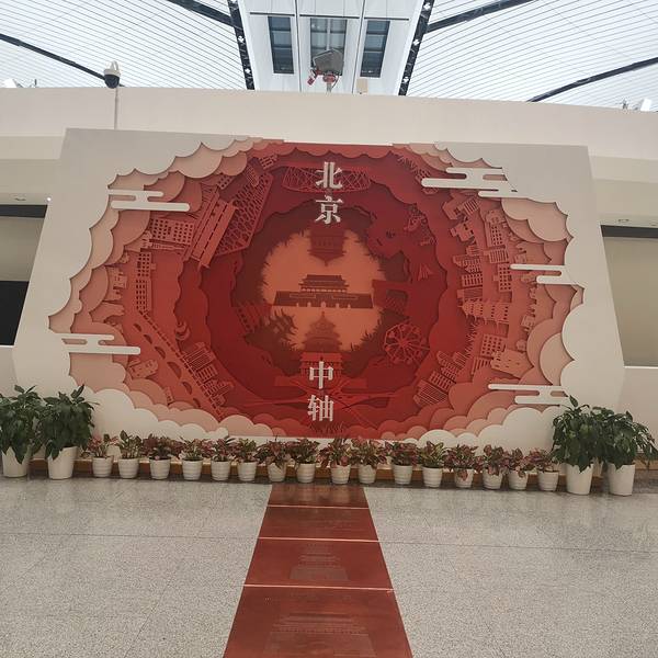 机场最顶层有很多适合拍照打卡的地方,有中轴线的标志,机场与天安门,故宫,景山,鸟巢都是在一条中轴线上。