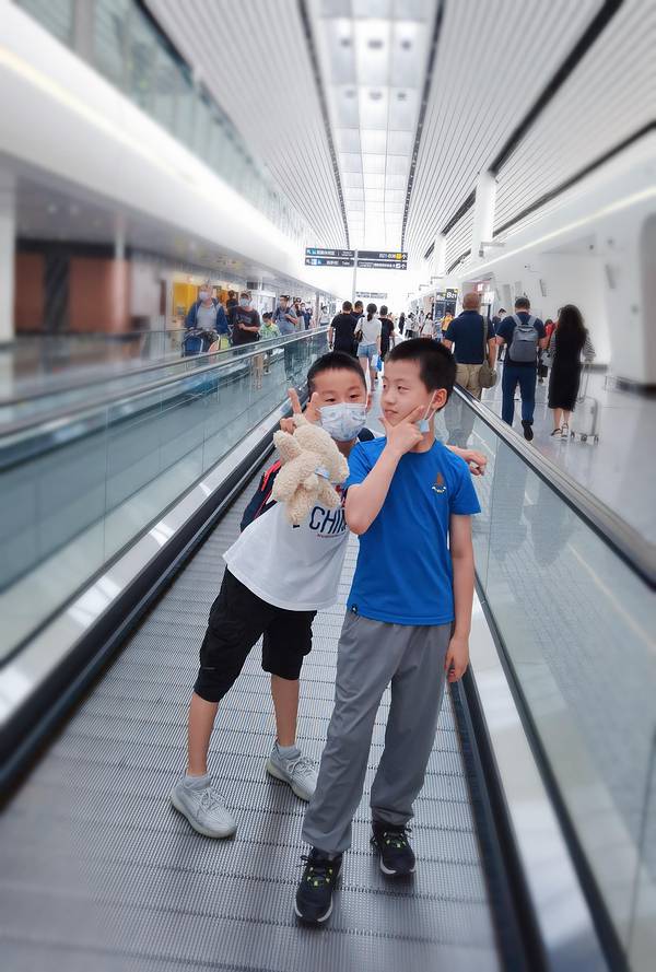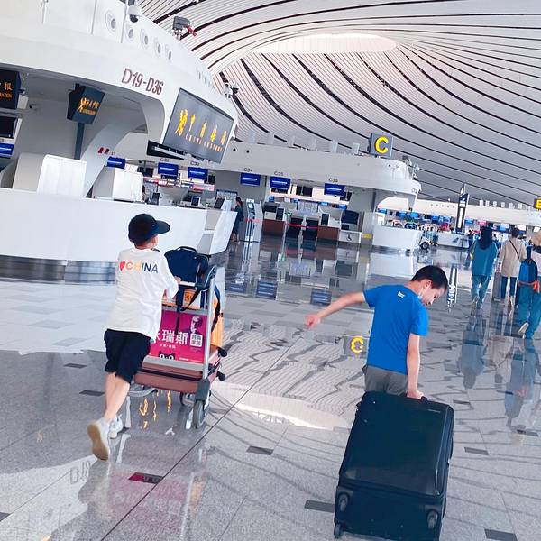 7.9 星期五 孩子中午考完试,下午我们就出发啦,飞机是下午17:55出发的,下午2点就从家里出发3点到大兴机场。小同学兴奋的一个人背两个包 手都勒红了 ...你不用写作业,我不用看你学习,母慈子孝第一次来大兴机场...