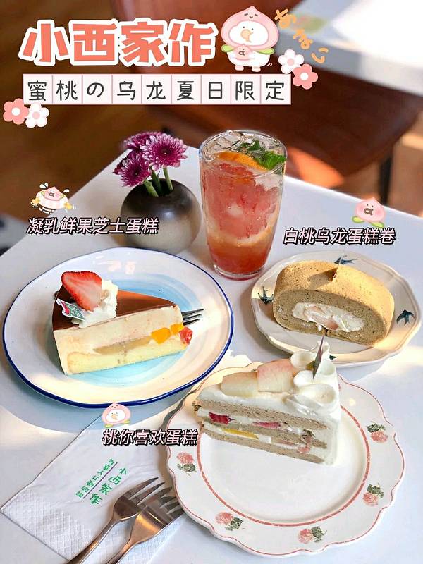 🍰推荐一家宝藏甜品店,以前每次在珠江新城办事都会顺道过来下午茶,除了蛋糕出品一直保持着水准,还有很喜欢他们简约的欧式风格装修布置,这家店还有一个专门为👶🏻小朋友设计的空间,里面摆放着🧸玩具,还有很可爱的桌椅,真的很贴心哦! - ‼️最近他们推出了🍑蜜桃乌龙当季新品,每天每种只有40份,所以建议早点来哦! - 桃你喜欢蛋糕切件 💰38/件 用大红袍加上🥛牛奶鸡蛋做成的乌龙茶蛋糕底,夹心两层水果被🧀芝士慕斯包裹着,发酵乳香和清新水果融合的味道真的很搭! - 蜜桃乌龙蛋糕卷切件 💰28/件 乌龙茶蛋糕底软绵棉的,包裹着淡奶油和蜜桃,奶油一点也不腻,加上水果的香甜清爽简直完美CP! - 凝乳鲜果芝士切件蛋糕 💰38/件 颜值很好看的戚风蛋糕,底部的是用法国🧀芝士做成的乳酪,中间是柠檬芝士水果,顶部是法国🍫巧克力淋面,喜欢吃巧克力的不要错过这款哦! - 🌟店名:小西家作(广粤天地店) 📍地址:广州天河区海明路广粤天地内 ⏰时间:AM10:30~PM22:00 🚇交通:地铁5号线潭村站A出口步行730米