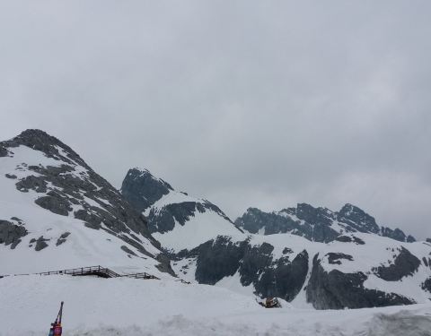 玉龙雪山是丽江最有名的景点之一,景区面积很大,但是游客都必须在餐饮中心这里乘坐景区观光车去各景...