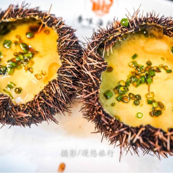【海胆蒸蛋】:海胆蒸蛋是第一次品尝,毛茸茸的外观,里面是一片嫩黄。轻轻吃上一口,嫩滑无比,吃了还想再吃。