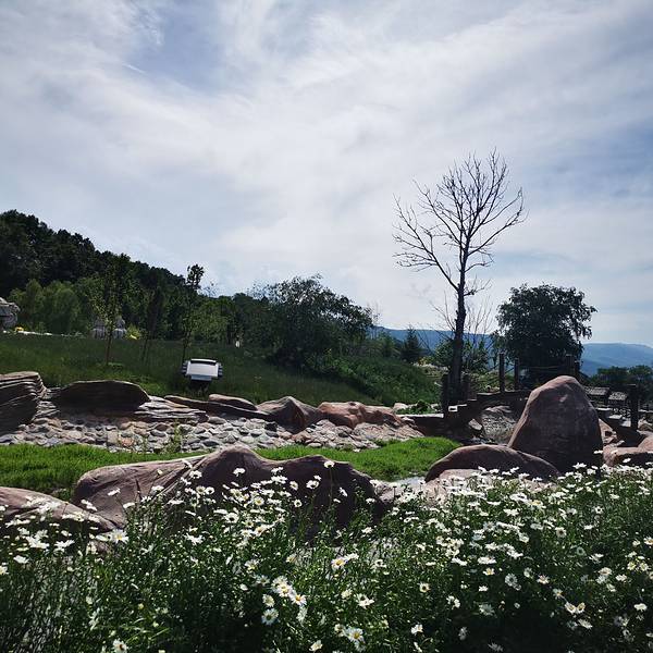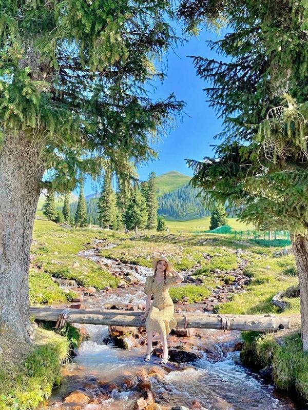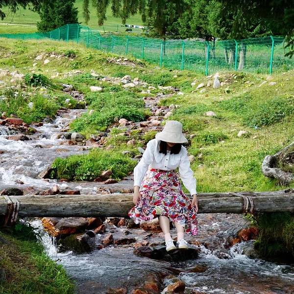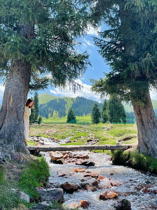 推荐网红小桥📸拍照点,站在溪流木桩上,远处就是蓝天白云和森林草甸