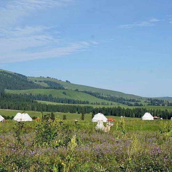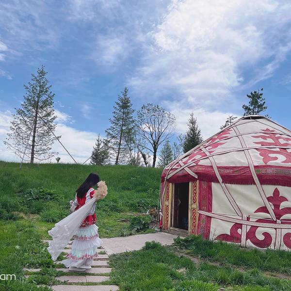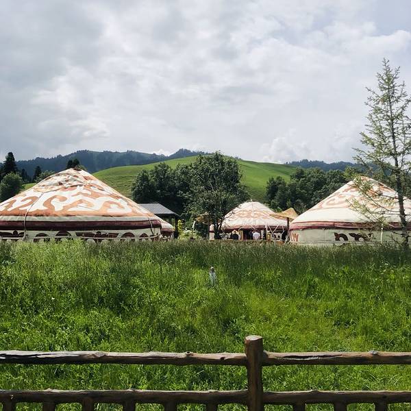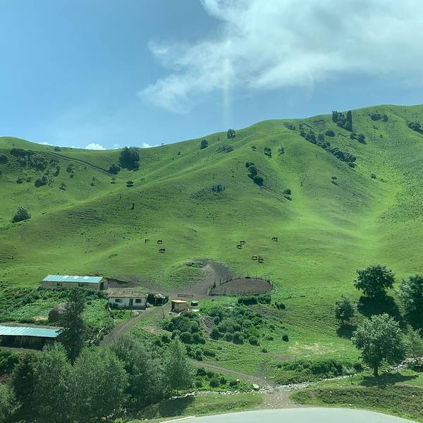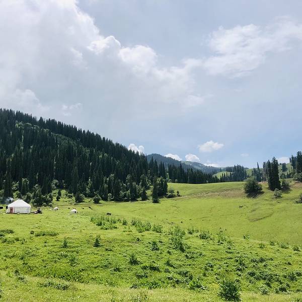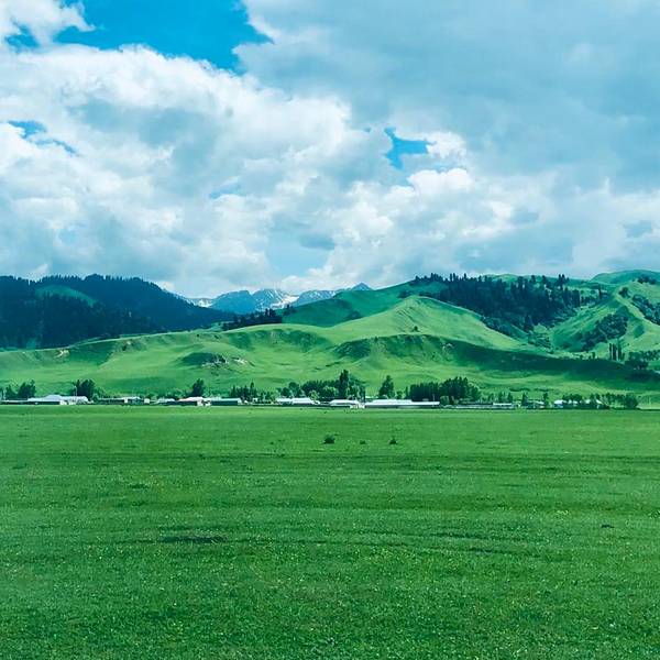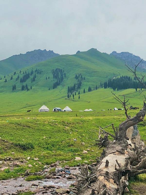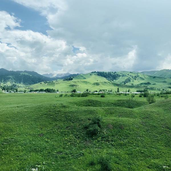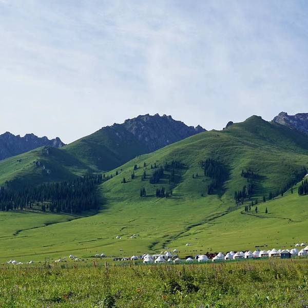 我们乘坐大巴车在最后一战游牧人家下车后,就看到满眼的绿色,远处有几个白色的蒙古包散落在这片绿色里。到了游牧人家...昨天去的巴音布鲁克草原是一望无边的起伏很小的平原草场,今天的那拉提是在山上的空中草原。