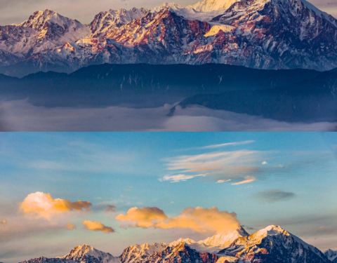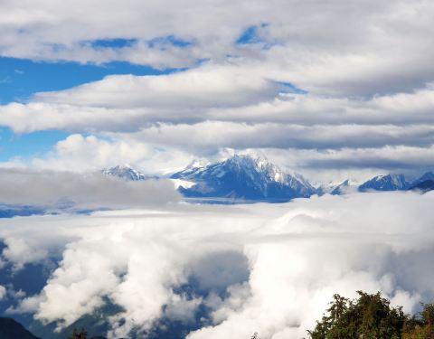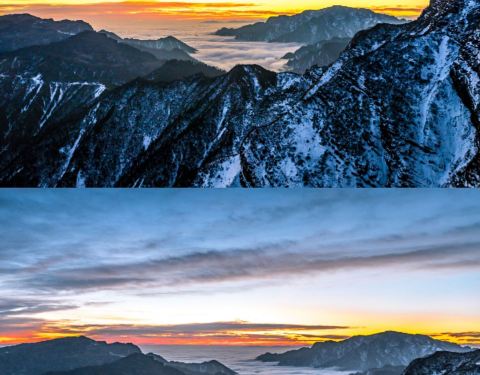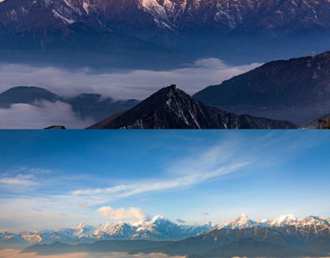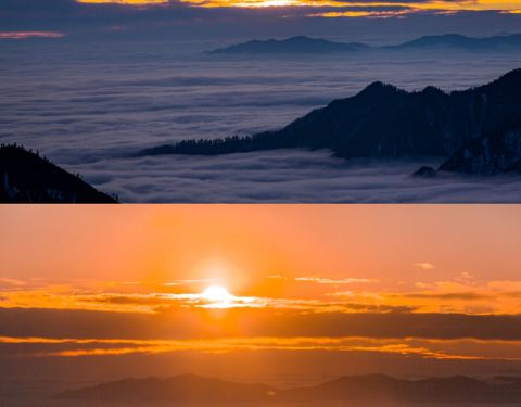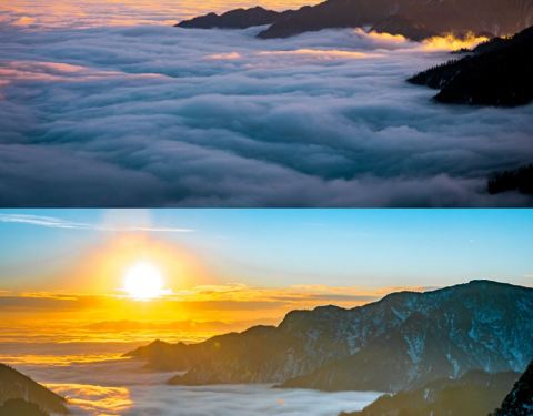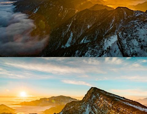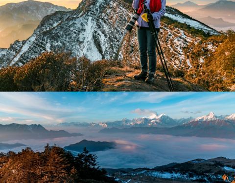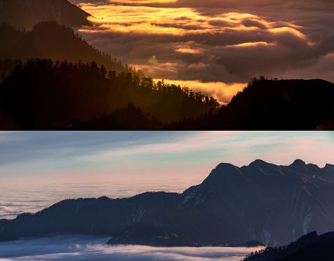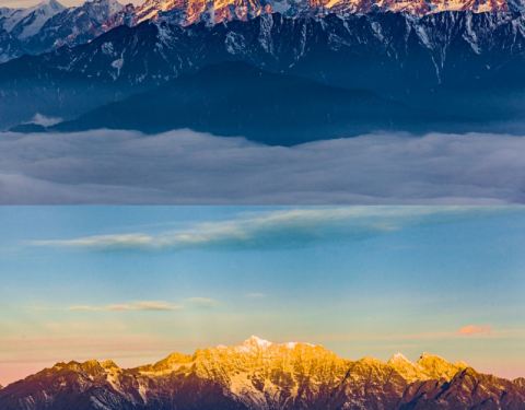 华尖山与二郎山相邻,离贡嘎更近,视野开阔,可观云海云瀑布,日出日落,星空晚霞,及贡嘎山全貌,山顶植被较好,有成片杜鹃花林及高山杉木林,快到山顶时有多个大草坪。牛背山的美誉自不必多说,可如今它已在改造为景区,暂未对外开放,而红岩顶、四人同、华尖山便成了众多摄影发掘的观云海替代点;到达这里需要乘坐当地人的摩托车到达最近的半山腰,而后徒步三四个小时到达山尖,徒步虽苦,见到日出日落的贡嘎一切都是值得。