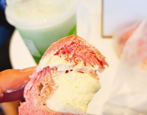 浦西万达1号门旁边新开了一家奈雪,开业期间人超多的,经常可以看到店门口排着长长的队伍。开业前三天有买欧包送饮料,前100名还有送周边。去试了一下霸气橙子+霸气芝士草莓,还有店员推荐的欧包一颗大榴莲。不得不说他家的欧包的确是不错,一颗大榴莲拿到手上还是热乎乎的,里面的榴莲真的很有份量,趁热吃味道不错,就是一个可能没办法一下子吃下去会有点腻。饮品的话,我喝的这两款没有太多惊喜,跟其他家的同款差距不是太大。