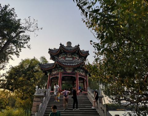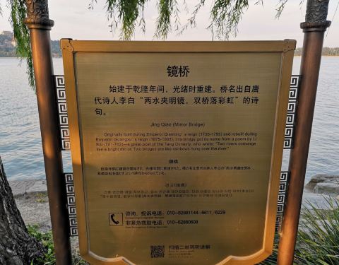镜桥位于颐和园昆明湖西堤的中部。据介绍该桥始建于乾隆年间,在光绪时期重新修建,桥的名字是出自唐朝诗人李白 “两水夹明镜,双桥落彩虹”的诗句。桥上建的是一座有着八柱、八角重檐的桥亭,精致的外观,是六桥...