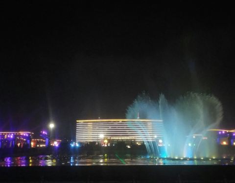 黄岛区市民文化广场,因为是新区市民广场,这广场比较宽大。广场修得很多优民项目,有篮球场等体育休闲运动场。晚上还有漂亮的音乐喷泉。