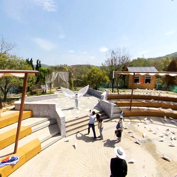 乘坐班船,吹着暖风,呼吸着新鲜的,甚至是带着甜味的空气,整个人都感觉到轻松舒适。在湖面上前行,两岸的小岛纷纷从两侧略过,水波荡漾,激动得不停拍照,舍不得放下手机。沿途经过织女石,神似一个侧面的古代美女。有发髻,有眉眼,好像是在翘首相望着什么。这就是瀛湖八景中的“织女临江”。据说每年七夕,都有很多人来织女石祈福爱情。 约半小时,到达金螺岛。金螺岛是一个四面环水的小岛,岛上有瀛湖标志性建筑螺峰塔。金螺岛顾名思义,是因为它形似海螺,又屹立于湖中,取的是苏东坡诗句“白银盘里一金螺”的意思。岛上的建筑风格儒雅夺人,亭台楼阁又有别于苏州园林风格,正好印证了瀛湖是“西北小江南”的雅号。螺峰塔共有5层,登上螺峰塔,可以远眺瀛湖全景,每一层都能从不同角度看山水与天际连为一体的美景。岛上还有祈福姻缘的月老像,爱情博物馆,许愿长廊,比翼鸟和同船渡,是名副其实的爱情打卡地。在爱情博物馆可以租古代新娘新郎的礼服,感受一下什么叫做执子之手,举案齐眉。在许愿长廊可以在许愿牌上写下祈福的话,亲手挂在长廊上,让春风拂过许愿牌,一遍遍读你的心愿。春季正值瀛湖风景最美的时候,金螺岛婚纱照旅拍也很火,在岛上就遇到两三对。金螺岛白鸽广场要赞一下,给孩子买了鸽粮,一家人玩得很开心,美照拍了一堆。