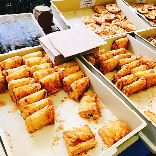只在周六上午开放的面包集市 到了先去取号,逛逛其他小摊子,等叫号就可以进去挑面包了!硬欧法棍可颂马芬可露丽各种挞和派,挑到眼花缭乱。 随便拿的几个:鸡肉派|蘑菇挞|柠檬挞|巧克力马芬都好吃~