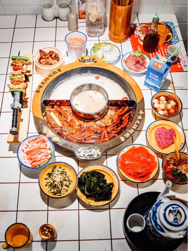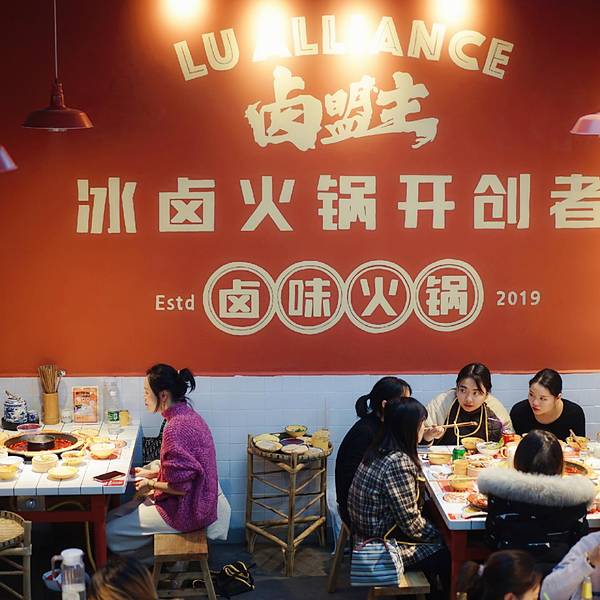 成都美食探店|头一回吃加冰块煮的火锅 🔺卤盟主卤味火锅(春熙概念店) 📍地址:东大街188号时代华章2楼 🚇交通:地铁2/3号线春熙路站E2口步行300米 ⏰营业时间:11:00--次日3:00 💰人均:60+ 〰️〰️〰️〰️〰️〰️〰️〰️〰️〰️〰️〰️〰️ 🍲你吃过用冰块煮的火锅吗?我也是头一次在成都吃到。这家叫做卤盟主卤味火锅的火锅店,在成都首创❄️冰卤火锅的做法,受到了很多人的喜欢。 🏮装修用的是大片的红色,看上去就很中国风。用一整面墙做了大面积的绘画,很符合火锅店热烈的风格。 🍵吃火锅前有个喝头茶的仪式,很有江湖气息。这卤凉茶喝着微甜,解辣又下火。 🌶️他们家最大的特色就是冰卤火锅,也就是把火锅底料和冰块放在一起。据说加冰块能保持锅底牛油的味道,解腻降燥。等冰块在锅里慢慢地融化,低温慢煮,使底料的味道更好地散发出来。 ✔️推荐菜品 ⚡️【一剑捅江湖】名字实在是太霸气了。肥肠煮软了很好吃,有淡淡的卤味,更是软糯Q弹,因为之前卤过,会更入味。 🥩除此之外,火锅基本的涮品也都有。肥牛卷、腰片、鸭肠、毛肚,吃火锅当然是以荤菜为主啦! 🥓【鸭肠】的分量超级多,竟然是用小时候喝茶用的杯子(四川话叫“盅盅”)装的,满满一大杯全是,吃得够爽。在锅里面上上下下涮个几下,鲜嫩爽脆,口感很棒。 🍤【火龙果虾滑】还是第一次吃。像是一颗大大的红心,没想到火龙果和虾滑还能搭配到一块。因为有了火龙果的加持,涮出来的虾滑更嫩一些,还带着水果的清甜。很值得一试。 🍗【卤味】也是重头戏,卤鸡爪、卤鸡胗、卤排骨、卤牛肉、卤猪蹄都有。分量不大,可以吃不同的卤味。比较推荐卤牛肉,卤得很入味。牛肉炖得软烂,口感很棒。