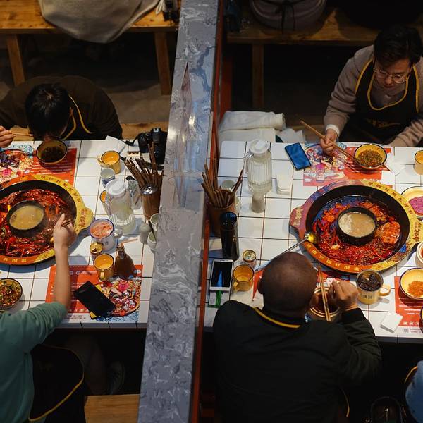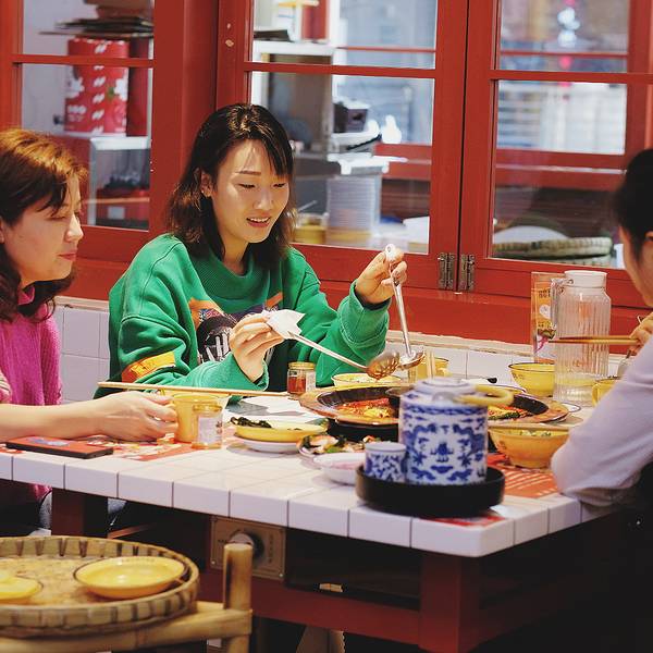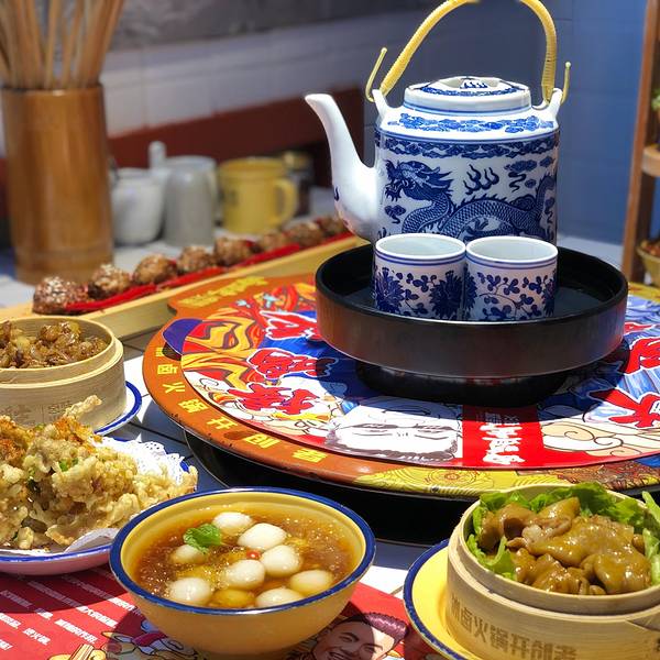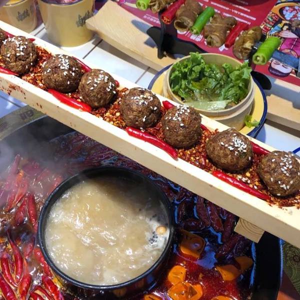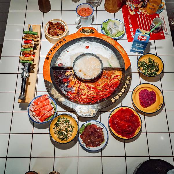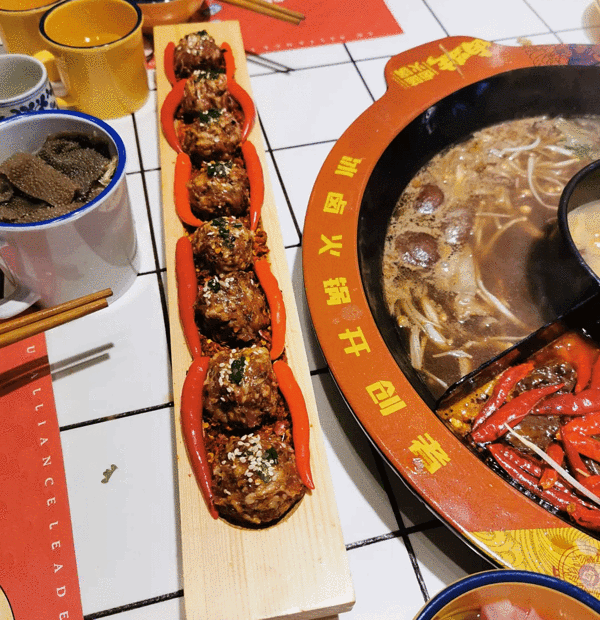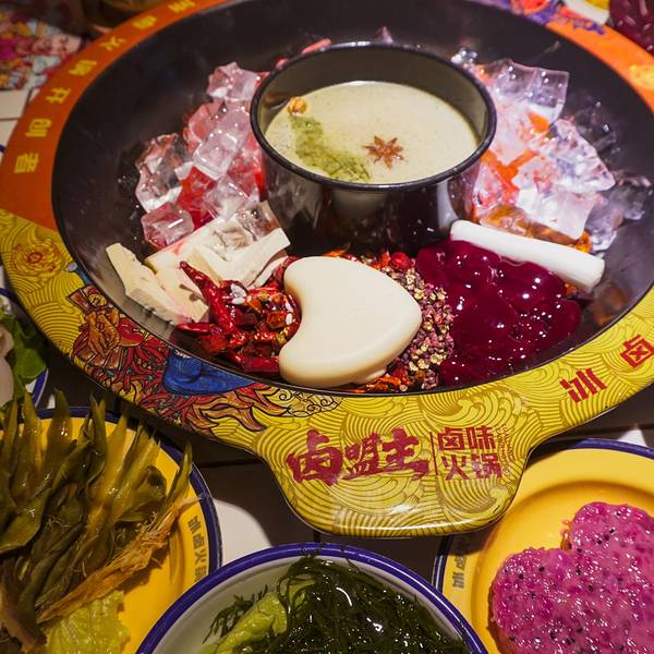 成都火锅千千万,找到好吃的火锅不难。为了吸引食客,各家火锅店也是各展身手,创意创新样样精通。你吃过用冰块煮的火锅吗?我也是头一次在成都吃到。这家叫做卤盟主卤味火锅的火锅店,在成都首创冰卤火锅的做法...成都火锅千千万,找到好吃的火锅不难。为了吸引食客,各家火锅店也是各展身手,创意创新样样精通。你吃过用冰块煮的火锅吗?我也是头一次在成都吃到。这家叫做卤盟主卤味火锅的火锅店,在成都首创冰卤火锅的做法,受到了很多人的喜欢。一开业就受到了很多人的关注,这其中有知名明星,还有众多网红,当然也不乏食客。装修用的是大片的红色,看上去就很中国风。用一整面墙做了大面积的绘画,很符合火锅店热烈的风格。餐桌的桌面做成了小瓷砖的样式,就连煮火锅的铁锅也是红彤彤的,看着就让人有食欲,也在着寒冷的冬天变得更加温暖。吃火锅前有个喝头茶的仪式,很有江湖气息。这卤凉茶喝着微甜,解辣又下火。他们家最大的特色就是冰卤火锅,也就是把火锅底料和冰块放在一起。据说加冰块能保持锅底牛油的味道,解腻降燥。等冰块在锅里慢慢地融化,低温慢煮,使底料的味道更好地散发出来。锅底中的香料逐渐挥发出悠长的香味,等待的过程其实就是香料逐渐浓香的过程。吃着冰块煮的火锅还是头一回,味道确实比平常吃的火锅特别,香味更加绵长。而且不同于传统的牛油火锅底料,卤盟主卤味火锅还增加了川式传统卤料味道的煮锅。这种卤味主要来源于香料和卤水,更加入味一些,也相对比较清淡。这里的菜品都是很新鲜的,而且他们家必点的一道菜就是肥肠,名字实在是太霸气了,叫做:一剑捅江湖。其实就是卤肥肠切成节,再串上青红双椒,实在很有趣。肥肠煮软了很好吃,有淡淡的卤味,更是软糯Q弹,因为之前卤过,会更入味。除此之外,火锅基本的涮品也都有。肥牛卷、腰片、鸭肠、毛肚,吃火锅当然是以荤菜为主啦!他家的鸭肠的分量超级多,竟然是用小时候喝茶用的杯子(四川话叫“盅盅”)装的,满满一大杯全是,吃得够爽。在锅里面上上下下涮个几下,鲜嫩爽脆,口感很棒。火龙果虾滑,还是第一次吃。像是一颗大大的红心,没想到火龙果和虾滑还能搭配到一块。因为有了火龙果的加持,涮出来的虾滑更嫩一些,还带着水果的清甜。很值得一试。他家的卤味也是重头戏,卤鸡爪、卤鸡胗、卤排骨、卤牛肉、卤猪蹄都有。分量不大,可以吃不同的卤味。比较推荐卤牛肉,卤得很入味。牛肉炖得软烂,口感很棒。看着这卤汁,都想浇在白米饭里就着吃。在成都吃火锅,怎么能够少了冰粉和醪糟汤圆呢。里面的料很丰富,解辣又解腻。就餐Tips: