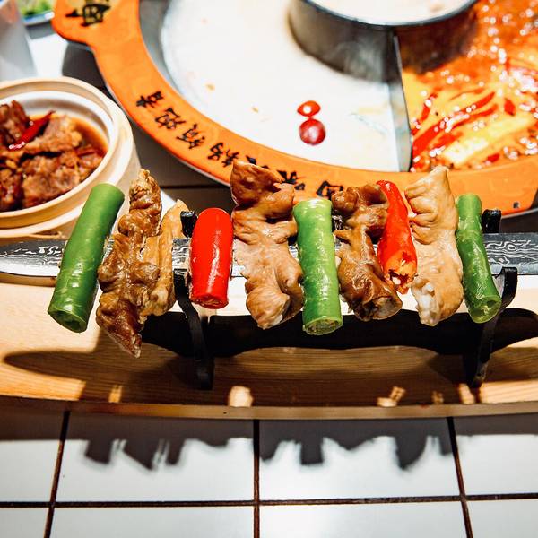 一把像模像样的铁剑,穿起一串青红辣椒和肥肠段,肥肠是卤过的,本身就够味,在红锅里再煮烫,更是让人回味。这个蘸上干碟更好吃。