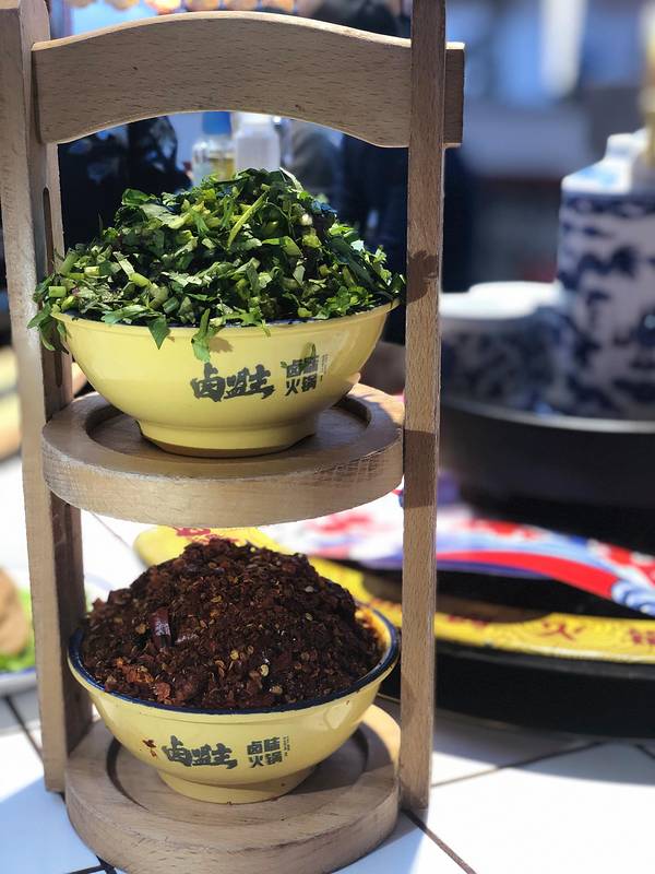 第二天早上起来就中午了,今天天气还比较好,所以在街上逛了一圈,发现这边的特色小吃还是挺多的呢。不过我们准备先去吃个中午饭再来太古里逛逛,因为毕竟是答应了闺蜜带她去吃我最喜欢的一家火锅——卤盟主卤味火锅。上次还是和同学一起在春熙路玩才发现的这一家火锅。就在东大街188号时代华章二楼,位置还是挺好找的,周围交通便利。点了招牌的卤味红锅,锅底有豆腐血旺和冰块,问了服务才知道说是加冰块是为了保持锅底的牛油味,顺便中和锅底的温度,让锅底油脂缓慢溶化,锅底就会越来越醇香。中间的是卤味锅底,闻起来也是非常的香,烫点素菜什么的也是非常的入味好吃。 菊花残:真的真的慎点,自认为很能吃辣的闺蜜一个都没吃完就被辣的不行。就像是辣椒和肉剁在一起,之前不知道这是什么辣椒,居然能有这么厉害。反正就是超辣超辣的那种辣。点了我的最爱,双味牛肉,就是有两种味道的牛肉,一碗裹满辣椒面的牛肉,一碗裹满香菜的牛肉,大红大绿的,两种都是深得我心,因为本人很喜欢吃香菜。香菜牛肉涮在红锅里很香,不用蘸油碟都是美味十足。麻辣味的,吃起来够味,辣的过瘾,牛肉都很嫩都是大片大片的,吃起来十分的过瘾。 肝胆相照也是一道比较有特色的菜,摆盘造型也很独特,超嫩超薄的肝片,在滚烫的红锅里烫几下,配上秘制的咸蛋黄酱,这是你绝对没尝过的舌尖美味。卤味锅烫素菜很好吃的,连一向挑剔的闺蜜都赞不绝口。