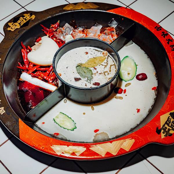 - 中间的是卤味锅底,闻起来也是非常的香,烫点素菜什么的也是非常的入味好吃。强力推荐