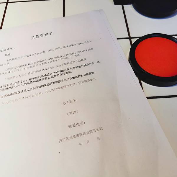 这里还有一道菜叫做菊花残,吃完就免单!用了超级辣的辣椒做成,吃之前还要签确认单,有点吓人,勇士可以来尝试!