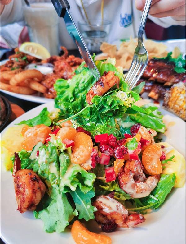 松软程度和口感层次都极佳,第一次来,一定记得留点肚子给ta 「大虾沙拉」 个大量多,铁板上烧了...