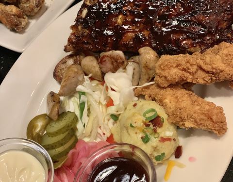 吃了一款肉的拼盘,如第三张图,只有鸡翅和肋排肉眼可见,好吃的香肠切成小块了,请仔细辨认