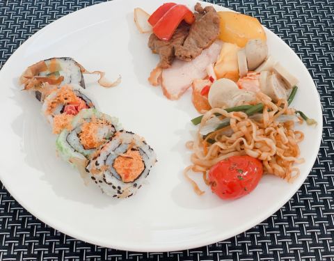 口味不错,品种还算不少,特别是水果种类多味道好。环境很棒,一边是海滩,一边是泳池。边吃边赏景,很惬意