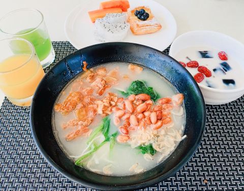 - 口味不错,品种还算不少,特别是水果种类多味道好。环境很棒,一边是海滩,一边是泳池。边吃边赏景,很惬意