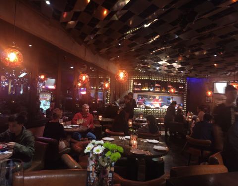 第二次来了,这次选了一个高台的位子,到没注意离边门比较近,偶尔有人进出,就会有冷风吹进。 菜基本点的还是上次那几道,也就一两道有所不同,酒的价格不便宜,八点前还可以享受买一送一的优惠。 这次的香肠不是很喜欢,又老又咸。鸡翅看上去很辣很油,但实际不是很辣,应该是放了不少番茄,所以颜色红了点,吃上去也比较嫩。点的长岛冰茶装饰还不错,但是淡了很多。布朗尼甜品比较喜欢吃,搭配酸奶和冰激凌,不腻口。