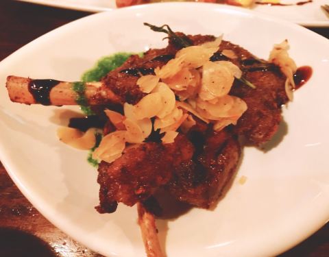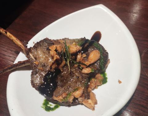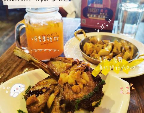 去的时候,大约晚上7店左右到店了,基本上位子已经坐满了,外面也有露天位,反正店还是蛮大的,一进门就看到吧台位有一个个大大的酒柜~~上面放满了各种酒,还是非常吸引人的哦!就是里面布局有点紧,位子之接靠的...去的时候,大约晚上7店左右到店了,基本上位子已经坐满了,外面也有露天位,反正店还是蛮大的,一进门就看到吧台位有一个个大大的酒柜~~上面放满了各种酒,还是非常吸引人的哦!就是里面布局有点紧,位子之接靠的比较近~~人多的时候会显得有点拥挤 |西班牙风味烤羊架^ 一份西班牙烤羊架,一份上有2个,上桌的时候就闻到么淡淡的香味,上面还洒了一点坚果,尝上去肉很嫩,也没有骚味,好吃的,基本上每桌都会点的菜3 还有一份小蘑菇,然后自己又点了一杯酒~难得出来,肯定要犒劳一下自己喽 是愿意值得二刷的一家店