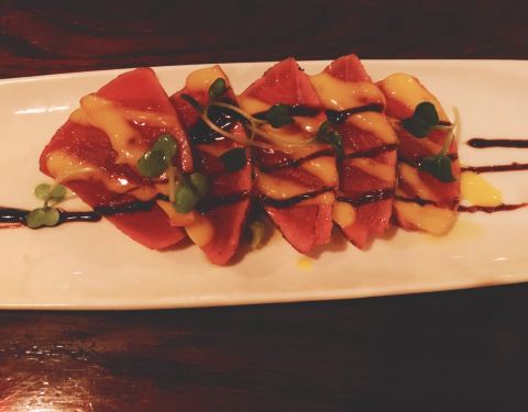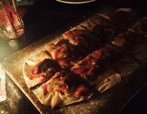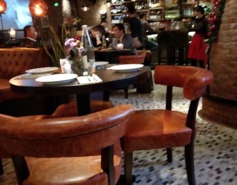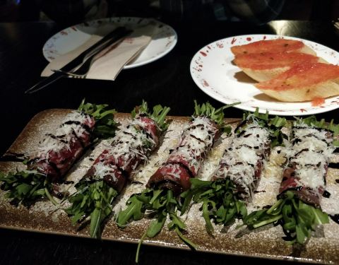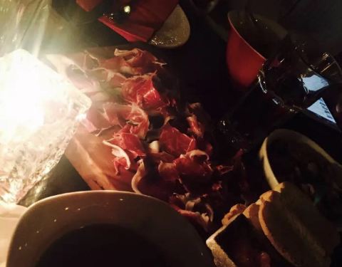 晚餐时分环境幽暗,座位桌子较小,上了一道菜外加酒水,基本就摆满了。氛围较轻松,服务生态度不错。 我们点了西班牙火腿和薄匹萨,烤牛肉薄匹萨味道很棒。
