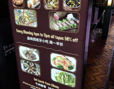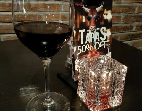 以前的披萨店,现在换成了西班牙餐厅,从周一到周五每天都有特惠活动,个人觉得周一最划算,全场小食半价,整本菜单一大半都是小食。 单点了一杯佐餐酒,还好有欢乐时光,可以续一杯,要不然95一杯实在贵了点。小吃的味道还不错,羊排和牛肉串都很好吃。