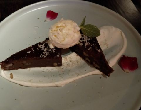 - 晚餐时分环境幽暗,座位桌子较小,上了一道菜外加酒水,基本就摆满了。氛围较轻松,服务生态度不错