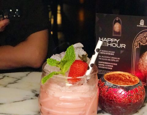 周末来芭芭露莎喝一杯。 中东风装修风格,仿佛置身在阿拉伯古老的国度里。昏暗的灯光下,墙壁上有光影投射。周围气氛热烈,氛围特别适合小酌一杯。 朋友点的草莓情缘和水果摩洛哥是无酒精鸡尾酒,样子美貌,粉粉...