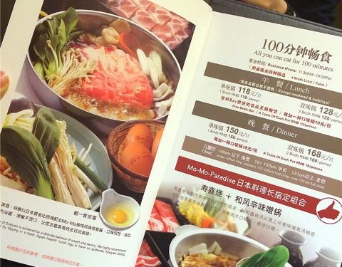 一家东京地道的日式火锅店,在台湾和曼谷都开了分店,这里是大陆的第一家。Mo-Mo牧场主打的是涮涮锅和寿喜锅,有不同价位组合的放题锅。食材主要是不同部位的牛肉和猪肉,每天都会有多种蔬菜提供,不论是肉类还是蔬菜都十分新鲜,品质上等。