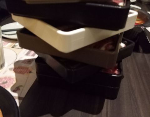肉肉还是牛肩肉和松阪猪肉比较好吃,鸡肉不灵额,有股味道。 蔬菜店员会推着小车来问要啥,阿拉啥都没要,肉都吃不下了还吃什么菜呀... 就把锅里原本搭配的那些菜捞掉了。 甜品也有六种,不过都不咋地,就个柠...