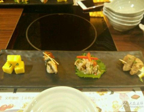 每人一份的拼盘 生鱼片77不要吃额 朋友吃掉额 看样子应该还ok 寿司么就直接把上面的虾肉吃掉了 味道还不错 就是有点干 黑色碗里面的是菌菇类的 调味甜甜的 咬下去很多汁 还有一坨不记得虾米肉了 印象里面味道是好吃额 单味锅是138/人 双味锅就要150/人了 一群吃货不甘心只安分吃个寿喜锅呀 服务员推荐说点击率第二高的是味增锅 我们就又要了这个 其实事实证明 完全木有必要额..... 以前吃寿喜锅都是小小一锅额 他们家的锅子很大额 瞬间木有精致的感觉了 配味增锅用的蘸酱 原来的锅底已经满够味道了 这个酱77木有动 蔬菜有餐车推过来让你挑的 大概有10种的样子吧 主食只有三种 米饭、拉面、乌冬面 我们只要了乌冬面 这个应该有煮过的 放到火锅里面弄热了就可以撩起来吃了 蛮Q的呢 肉一共是四种:牛肩肉、牛五花、猪肩肉、羊肉 网上推荐的是牛肩肉 77觉得牛肩肉比较柴一点 偶比较偏好牛五花 瘦油相间的口感比较好 猪肉和羊肉我们只要了一次 就再没点过了 真心不怎么样..... 甜品一共四种 咖啡冻和梅子奶酪 只是点来尝一下味道额 朋友都不爱 我倒觉得咖啡冻还蛮清淡额 冰淇淋是香草和抹茶两种 我口味是偏好抹茶 另外三个偏好香草 偶跟他们真是格格不入... 他们家的口味呢 77说不出可圈可点的地方 自助嘛 要求不能太高了 服务倒是可以滴 点菜的时候是下蹲服务的 弄得偶有点不习惯呢.....