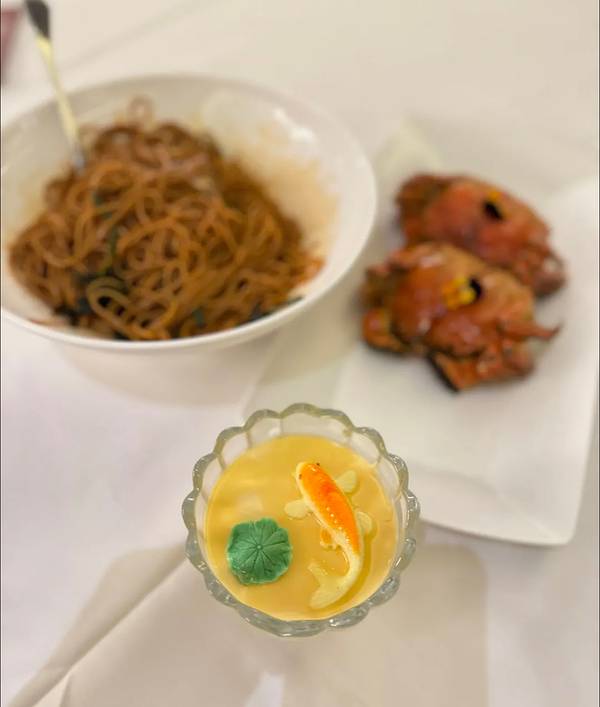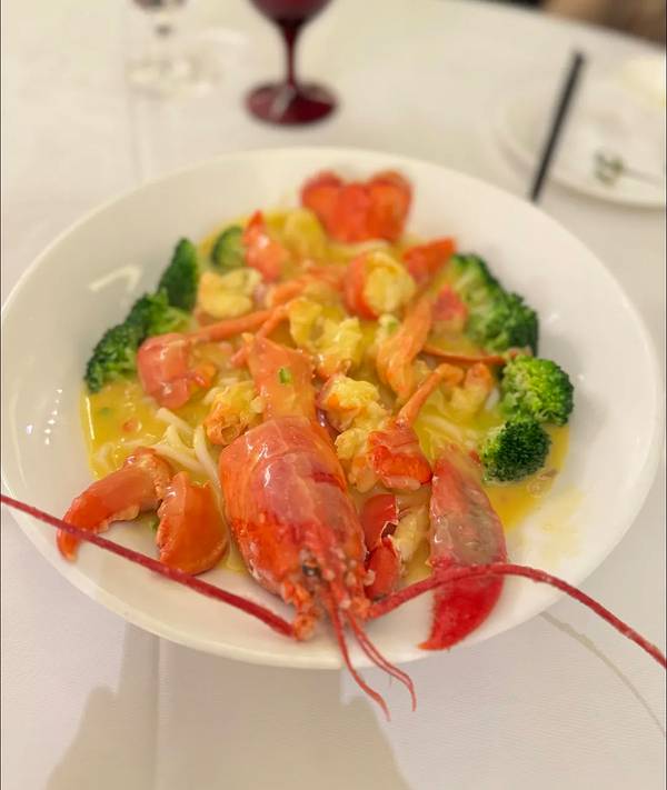 芒果沙律 蟹粉豆腐 鱼翅母鸡汤 清炒河虾仁 蔬菜色拉 鸭舌头 清蒸鲥鱼 锅贴 龙虾刺身 红烧蹄膀 糯米蒸甲鱼 椒盐大王蛇