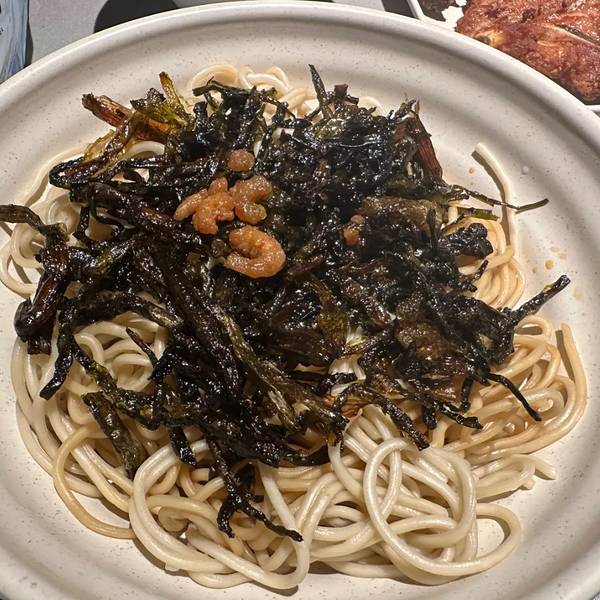 淮海路弄堂里的小店,如果打车来看到工商银行就不要再乱走了,旁白有个小门,进去就是,特别不起眼的小店,有个半地下室,有个小阁楼,晚上来的,屋内油烟味比较大。苔条黄鱼真心好吃,外皮酥脆,里面鱼肉细腻,也没有刺,刚炸出来什么都不蘸就非常鲜美了~浓汤大黄鱼面a,里面有一些雪菜,看上去有些凌乱,但是味道很鲜,汤底最后有点咸。面条也足够筋道,很多当地人在这里吃。