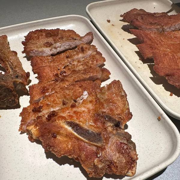 炸大排端上来一看就是满满的罪恶啊因为好油 口味蛮特别 是我奶奶做的那种口味 肉很厚的 淡淡的咖喱粉和五香粉味道