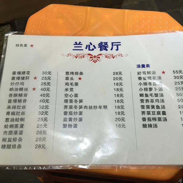 兰心餐厅(原店)是上海本帮菜里最正宗、性价比最高的餐厅,没有之一!酒香不怕巷子深,一起来到这家看了30多年的“苍蝇店子”,店真的很小,介绍上面说是11点开门, 我们11点准时踏入这家店,已经有3桌人开吃。因为是夏天,天气还是蛮热的,但抵不住我们对美食的执着。 「爆炒猪肝」奔着爆炒猪肝来的,我是来补铁的。味道不错,是我们记忆中浓郁的本帮菜。 「油爆虾」甜香可口,第一口就甜入心田,让人一尝就味蕾大开,可以吃十碗米饭! 「南乳空心菜」也不知道怎么做的!吃上去爽口的咧,仿佛吃了薄荷一样,清新无比,解腻非常,实力推荐! ! 「红烧肉」其实烧的不是很酥嫩,但是!不油腻这个一般吧,不算最棒的! ! 「椒盐排条」真的面粉几乎没有,肉绝对是大排骨头肉做的,嚼劲十足!而且炸的不油还很香! !也挺嫩的,口味适中。 「清炒鸡毛菜」因为进入夏天了,所以没有草头这个菜了,点了清炒鸡毛菜不错,看隔壁的小哥哥,吃了红烧肉就着一盘儿鸡毛菜全吃完了。 「小排冬瓜汤」小排汤,夏天喝就是用来去肿利水的,一小锅子。 总体来说吃的很舒服,上菜速度非常快,就是有点热热的,至于那些说环境差的,总店这已经装修了很好了! !以前都是木头桌呢!真棒!毕竟是老房子无法避免的,兰心,我吃本帮菜里的唯一选择! !