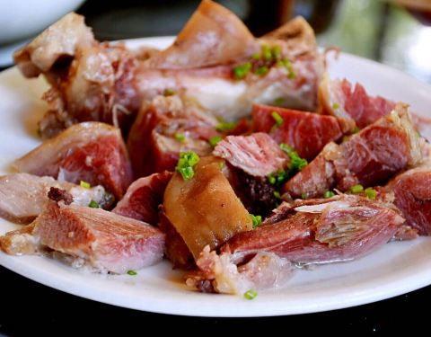 ...入口而化,咸蹄皮脆香味阵阵,当地湖虾个白嫩一口个,最后配一盘古镇特色时蔬,抿一口香茶,真是惬意