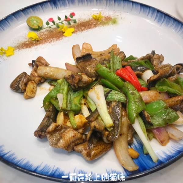 - 切成片后大火爆炒,佐以洋葱青椒,真的是最好的搭配,鳝鱼口感香嫩中还带点韧性,配菜洋葱青椒也好吃
