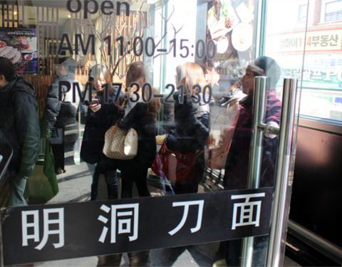 吃完烤肉,小伙伴又开始寻觅下一站,明洞刀面按偶偶的说法,要来总店吃,他自己也木吃过! 由于看错地址,导致我们一直在错误的地方瞎绕! 不过他家的牌子还真的不留心,不容易发现! 11:00-15:00 温馨提示:时间段以后只有饺子吃哦! 莫位妹子来此就是为了它! 继续排队,小伙伴们早已经习惯!等候时间不长,被安排了一个六人位,另外二位还在浮云中! 【餐前小菜】辣白菜,韩式餐馆必见的,口感一般! 【蔬菜】搭配肉肉吃的蔬菜,胡萝卜不错! 【明洞菜包肉】肉是放在水上蒸的,口感不错,好吃! 【双拼饺子】一笼6只,饺子感觉更像包子!辣白菜口味,口感更加开胃!白菜口味,就是木有放辣椒! 【刀面】第一口尝下汤,这味太熟悉了,多少次超市买了泡面回家泡开后的味道! 总结:值得一品的还是肉!