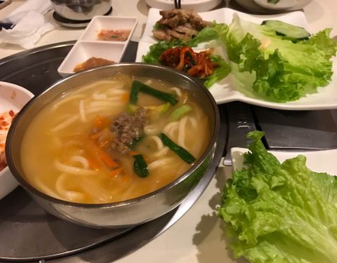 吃完烤肉,小伙伴又开始寻觅下一站,明洞刀面按偶偶的说法,要来总店吃,他自己也木吃过! 由于看错地址,导致我们一直在错误的地方瞎绕! 不过他家的牌子还真的不留心,不容易发现! 11:00-15:00 温馨提示:...吃完烤肉,小伙伴又开始寻觅下一站,明洞刀面按偶偶的说法,要来总店吃,他自己也木吃过! 由于看错地址,导致我们一直在错误的地方瞎绕! 不过他家的牌子还真的不留心,不容易发现! 11:00-15:00 温馨提示:时间段以后只有饺子吃哦! 莫位妹子来此就是为了它! 继续排队,小伙伴们早已经习惯!等候时间不长,被安排了一个六人位,另外二位还在浮云中! 【餐前小菜】辣白菜,韩式餐馆必见的,口感一般! 【蔬菜】搭配肉肉吃的蔬菜,胡萝卜不错! 【明洞菜包肉】肉是放在水上蒸的,口感不错,好吃! 【双拼饺子】一笼6只,饺子感觉更像包子!辣白菜口味,口感更加开胃!白菜口味,就是木有放辣椒! 【刀面】第一口尝下汤,这味太熟悉了,多少次超市买了泡面回家泡开后的味道! 总结:值得一品的还是肉!