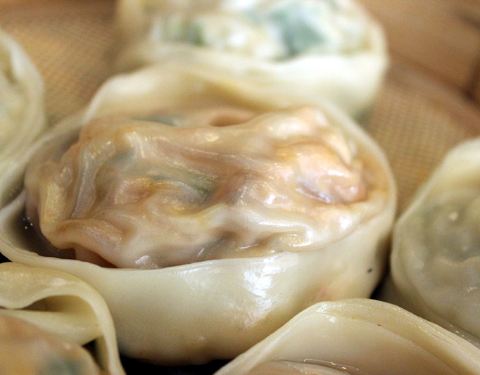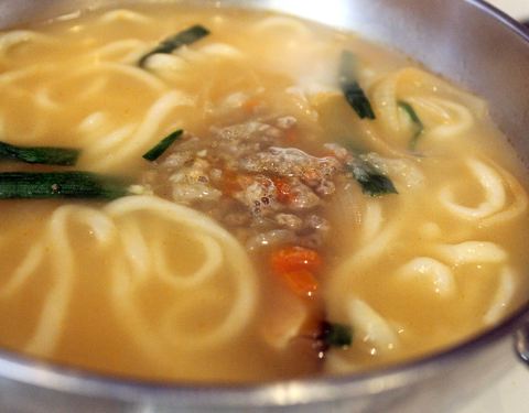 刀面很粗,口感润滑,韧性劲道。汤比较清淡,加了牛肉末和好几种煮透的蔬菜。大饺子一份六个,有韭菜味和泡菜味的,非常管饱。